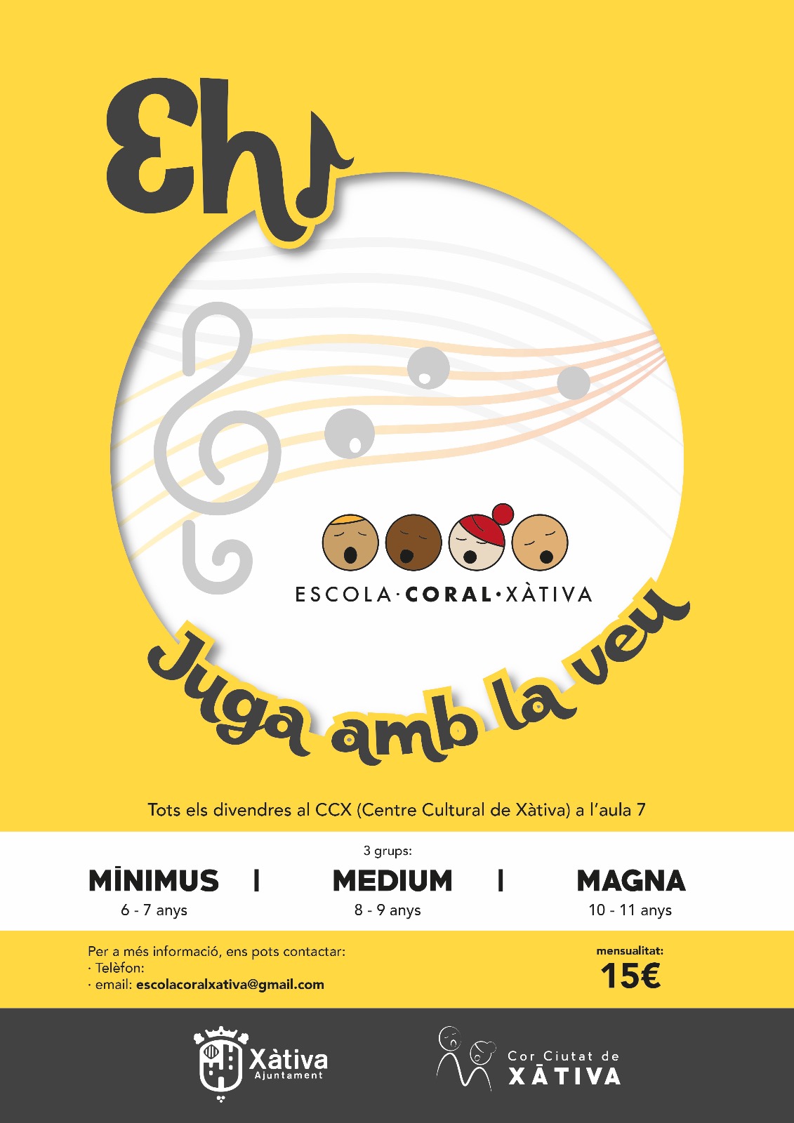 Este cap de setmana estarem a la “IV Feria de la Vuelta al Cole” que tindrà lloc el divendres 14 i dissabte 15 de setembre al CC Plaza Mayor de Xàtiva., on presentarem un nou i il·lusionant projecte que volem iniciar des del Cor Ciutat de Xàtiva i que és la nostra propia escola coral escolacoralxativa.com