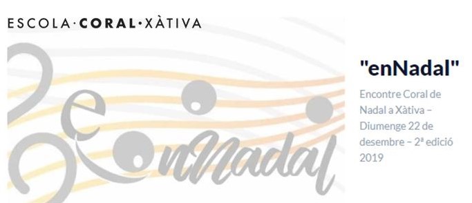Des de l’Escola Coral, amb la col·laboració del Cor Ciutat de Xàtiva, el suport de l’Ajuntament de la Ciutat de Xàtiva, iniciem la tasca de cara a la organització del 2n Encontre Coral de Nadal a Xàtiva. Aquest segon encontre està programat per al diumenge 22 de desembre de 2019 al Gran Teatre.