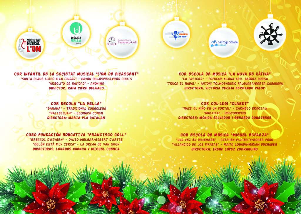 Grups Participants: Cor infantil de la Societat Musical l’Om (Picassent), Cor de l’Escola de la Vella (Xàtiva), Cor Col·legi Dominiques (Xàtiva), Cor Escola de Música la Nova de Xàtiva , Cor Col·legi Claret (Xàtiva), Cor Col·legi de La Inmaculada (Xàtiva), Cor Escola de Música Miguel Esparza (la Llosa de Ranes), Cor Escola·Coral·Xàtiva, Cor Ciutat de Xàtiva.