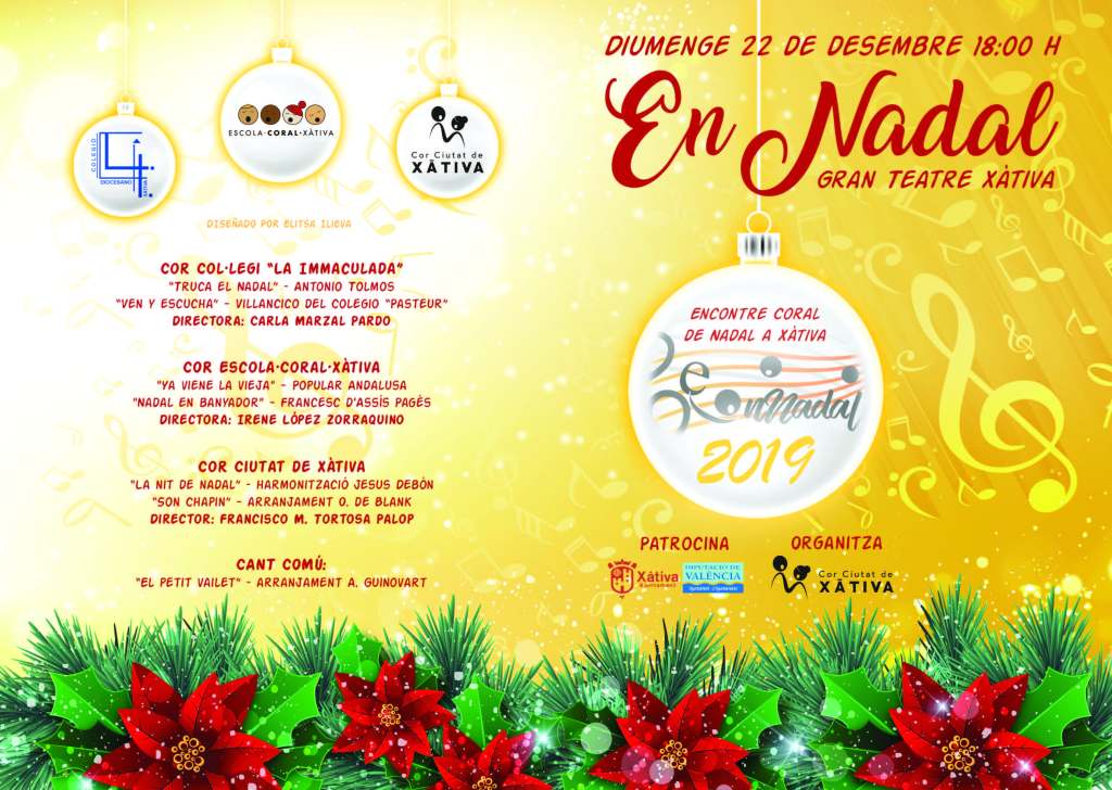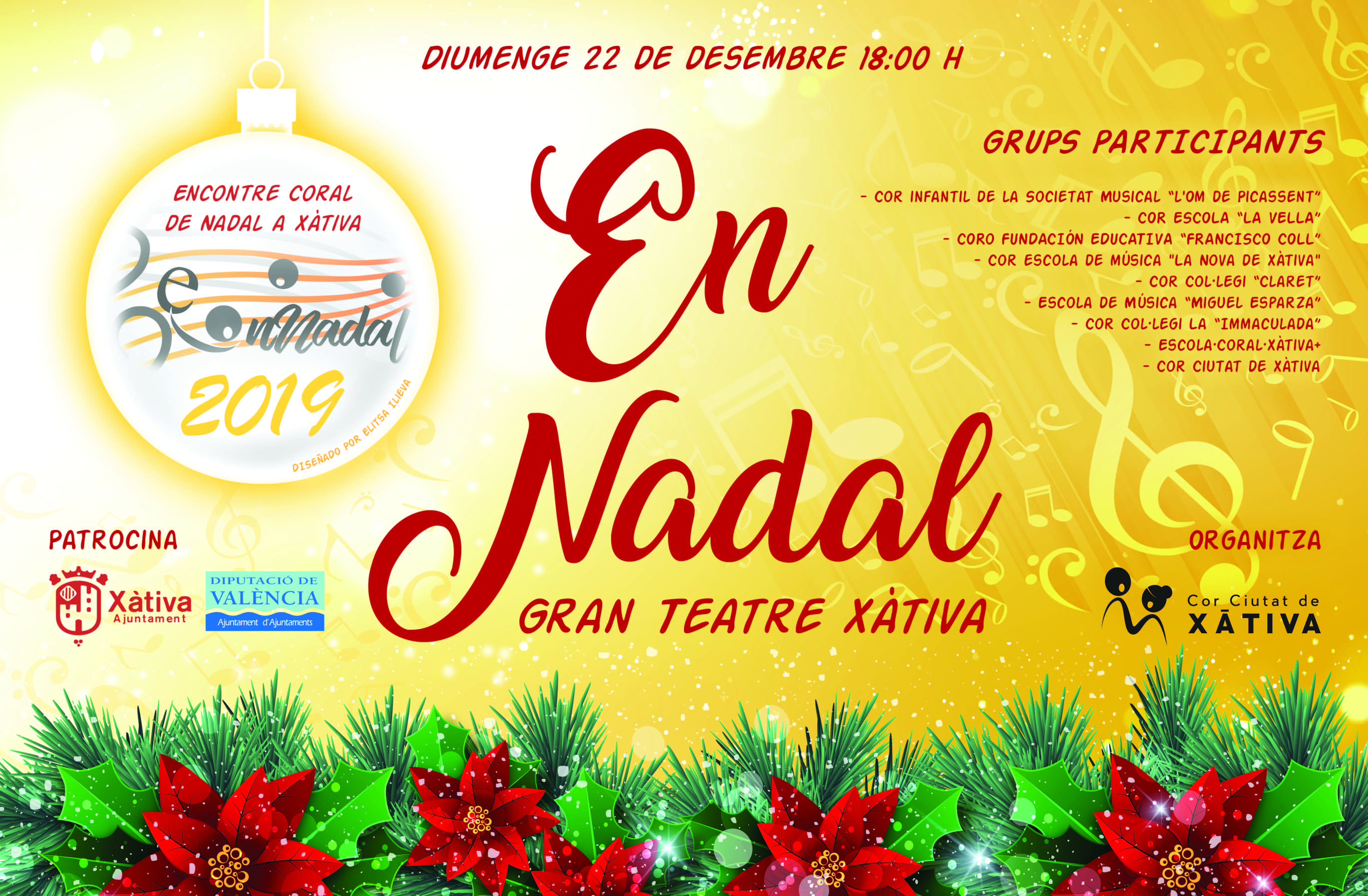 Ja està ací la segona edició de l’Encontre Coral “enNadal”. Des de l’Escola Coral, amb la col·laboració del Cor Ciutat de Xàtiva, el suport de l’Ajuntament de la Ciutat de Xàtiva i la Regidoria del Gran Teatre, vos informem que aquest segon encontre tindrà lloc el diumenge 22 de desembre de 2019 a les 18:00 al Gran Teatre de la ciutat de Xàtiva.