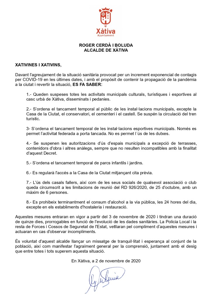 El Cor Ciutat de Xàtiva ha decidit suspendre el concert de «Cicle de Tardor» que estava previst per al proper 7 de novembre, a causa de la situació actual de la pandèmia i a la impossibilitat de disposar d’un lloc públic on realitzar-lo.