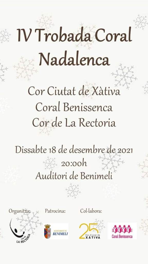 Demà dissabte 18 de desembre, el Cor Ciutat de Xàtiva actuarà en la IV TROBADA CORAL NADALENCA a l’auditori de Benimeli. Ho farà junt a la Coral Benissenca i el grup organitzador el Cor de la Rectoria de Ràfol d’Almúnia.